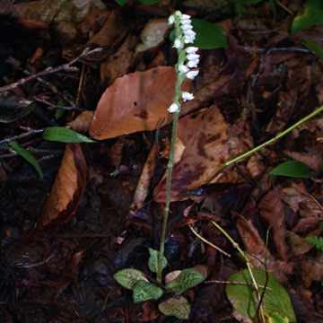 Perennial herb to 35 cm; scape with 3-5 bracts; leaf blades mostly 2-5.5 cm, variably white-reticulate; inflorescence loose, spirally secund, 3-6 cm long; galea 4-7 mm; lip 3-5.5 mm, shallowly saccate, the pouch longer than deep; anther acuminate, somewhat surpassed by the 0.6-1.7 mm rostellar beak.