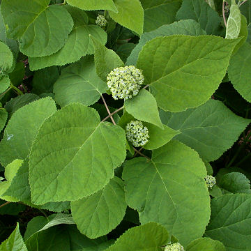 Low, branching shrub. Leaves opposite, serrate, acuminate, subcordate to acute at the base. Flowers white, in flattened or concave cymes, petals 5; sepals 10. Few marginal sterile flowers with showy bracts. Stems smooth with white pith.