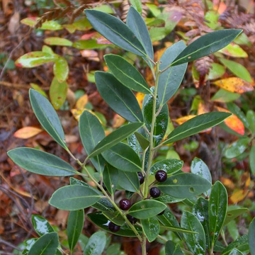 Shrub to 1-3 m; twigs finely puberulent; leaves coriaceous, evergreen, oblanceolate, obtuse, cuneate at the base, punctate on the underside, the margins with 1-3 minute appressed teeth on each side near the apex; flowers mostly 6-8-merous; staminate flowers in small, pedicellate clusters; pistillate flowers mostly solitary; fruit black, 4-5 mm, firm, dry, persistent; nutlets smooth on the back.