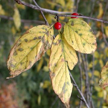Small or medium tree, occasionally to 30' but usually smaller. Leaves deciduous, alternate, elliptical, to 2-6" long. Flowers white, in 4 parts, dioecious. Fruits red, smooth, very round, to 1/2" in diameter, usually not persisting into winter. Young bark smooth, gray with raised lenticels, becoming dark gray and very rough with age.