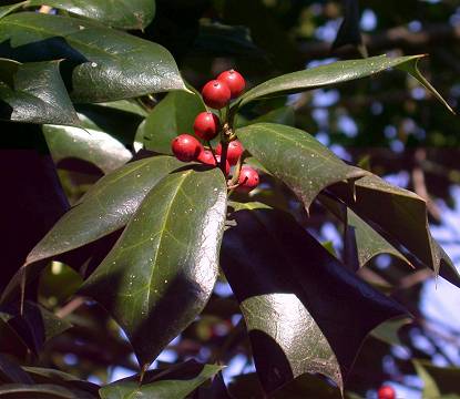 Medium tree, to 40' but usually smaller. Leaves evergreen, alternate, simple elliptical to elliptic-lanceolate, to 4" long and about half as wide, spiny toothed (less teeth in older specimens), dark green and shiny above, yellow-green below; petiole .25 to .5" long, minutely downy. Flowers dull white, 4 lobed; dioecious, the staminate flowers in cymes; pistillate 1 to 3 on a puduncle. Fruit a dull red, rounded drupe to 1/2" in diameter, matures in autumn and persisting into winter. Stems green when young, becoming rough with circular raised lenticels with age.