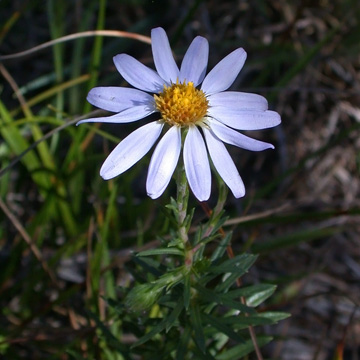 Perennial from a short caudex, sometimes with creeping rhizomes as well; stems several, slender, 10-50 cm, finely puberulent, becoming tomentose-puberulent upward; leaves numerous, firm, linear, entire, minutely scaberulous, scabrous-ciliate on the margins; nerveless except for a prominent midrib, the lowest ones soon deciduous; heads solitary or several in a mostly corymbiform inflorescence; involucres 6-9 mm; involucral bracts imbricate, firm, keeled, greenish hear the apex, finely scaberulous, acute to broadly rounded, the inner fringed-ciliate distally and usually with purplish margins; rays 10-20, violet, sometimes white, broad, 7-12 mm; disk yellow or purplish; achenes long-hairy; pappus double, the inner bristles elongate, firm, tawny, the about 1 mm or less.