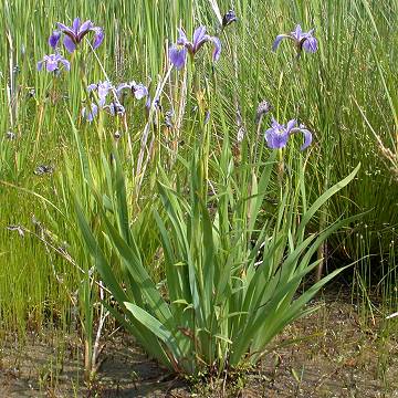 Another species, Iris versicolor L. looks very much like it except it is said to have stiffer, more upright leaves. In addition the sepal blades are more ovate to reniform, merely papillate (bumpy) at the base rather than hairy, and is unspotted or with a greenish yellow basal spot.