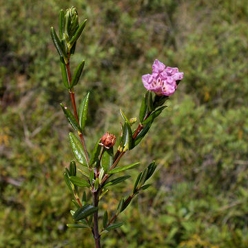 Small evergreen shrub, to 1 m high. Leaves shiny, deep green above, white-hairy below, opposite, simple, entire, linear to lanceolate, to 4 cm long, margin revolute. Twigs 2-edged. Flowers pink to magenta, 1.6 cm across, in terminal corymbiform clusters. Fruit a brown, 5-parted, subglobose, dehiscent capsule.