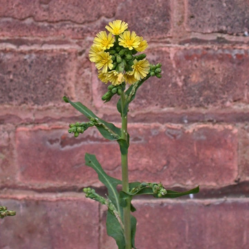 Herbaceous biennial, sometimes annual; stems 0.3-2.5 m, glabrous or coarsely hirsute, often more or less glaucous; leaves variable, entire or toothed to pinnately lobed or cleft, sagittate or sometimes narrowed to the base, to 35 cm long; heads numerous, small, with 13-22 yellow flowers; involucres 10-15 mm in fruit; achenes blackish, very flat, with a median nerve on each face, transversely rugulose, 4.5-6.5 mm total length, the slender beak from a little more than half to about as long as the body; mature pappus 5-7 mm.