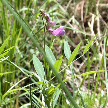Climbing, perennial herb, to 1 m high. Stems winged. Leaflets usually 3 to 4 pairs, stipules entire to serrate, lanceolate to lance-ovate, with a single, sharply acute lobe at the base. Flowers magenta-violet, fewer than 10 to a raceme; calyx smooth.