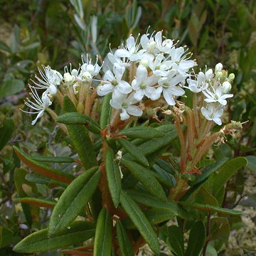 Small evergreen shrub, to 4' high and wide. Leaves alternate, simple, evergreen, to 2" long and .5" wide, elliptic or ovate to oblong, obtuse, margins recurved, glaucous and resinous, dark green above, covered with dark brown hairs beneath, fragrant, petiole to .25" long. Stems slender, rounded, young stems densely red-brown tomentose. Flowers perfect, white, to .75" across, in corymbs up to 2" across.. Fruits a capsule, 5 parted, opening from base to apex.