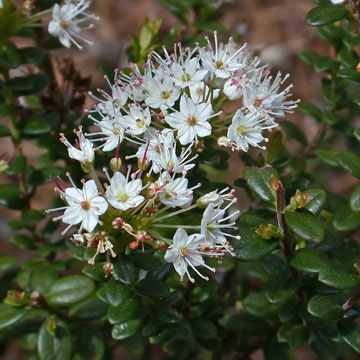 Widely branched evergreen shrub 10-100 cm; leaves alternate to opposite, ovate to oblong, 6-12 mm; pedicels 5-10 mm, glabrous or stipitate-glandular; corolla subrotate; petals 5, 3-4 mm, white or pinkish; stamens mostly 10, anthers purple; fruit 3-4 mm.