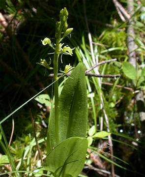 A pair of relatively large basal leaves. Flowers greenish to purplish-brown, 10 or more; spike not twisted; lip not spurred; one fertile anther.