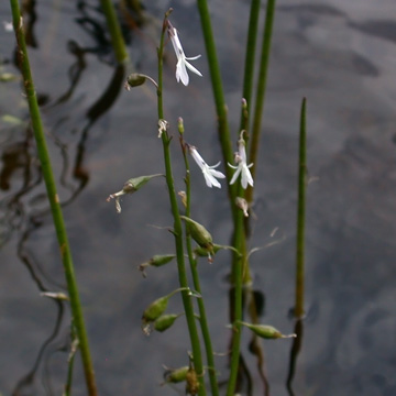 Herbaceous aquatic perennial; plants glabrous; stem upright, hollow, to 1 m, usually partly submersed; leaves in a basal rosette, linear, fleshy, hollow, 2-9 cm, outcurved near the tip; cauline leaves minute, filiform; raceme emersed (sometimes submersed), few flowered; bracts ovate, 2-3 mm; bracteoles none; sepals 2 mm; corolla pale blue or white, 1-2 cm, the lower lip bearded at the base within.