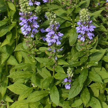 Herbaceous perennial to 4' high. Basal leaves to 6" long, lanceolate to oval, sometimes irregularly toothed, light green; stem leaves alternate, decreasing in size up the stem, sessile. Flowers; corollas blue, 5-lobed, less than 3cm long, the lower lip striped with white; calyx with conspicuous auricles at the base; stamens 5. Fruit a capsule.