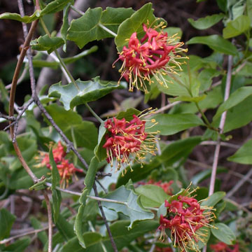 Smooth, climbing vine. Lower leaves variable; upper leaves perfoliate, green above, deltoid-ovate, as long or longer than wide, pointed at tip. Flowers yellow to reddish-purple; style hairy.