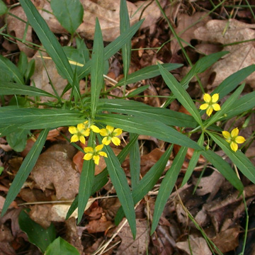 Lysimachia hybrida is similar in appearance but has a short, stout, freely rooting rhizome rather than long, slender, stoloniform rhizomes. It also has leaves that are about the same color below as above rather than the paler leaf undersurfaces of L. lanceolata.
