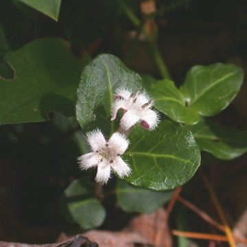 Mat-forming, creeping evergreen; stems rooting at nodes. Leaves opposite, round, to 2 cm long, petiolate. Flowers white, mostly terminal, 4-merous, paired, hypanthia united; corolla tube with short, recurved lobes that are hairy on the inner surface; ovary 4-locular. Fruit a bright red berry consisting of two ovaries fused together, 8-seeded, with the remnants of the two whorls of sepals on top.