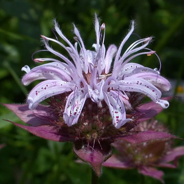 Herbaceous perennial; stems 30-60 cm, usually simple, glabrous or sparsely villous; leaves sessile or subsessile, ovate or deltoid-ovate to lance-deltoid, acuminate, serrate, rounded or subcordate at the base, sparsely hairy above, villous on the veins beneath; bracteal leaves often tinged with pink or purple, spreading or reflexed, lanceolate; calyx hirsute in the throat, its lobes subulate, often stipitate-glandular; corolla pale rose-purple to white, dotted with purple, 2.5-3.5 cm, the upper lip slender, nearly straight, about as long as the tube.