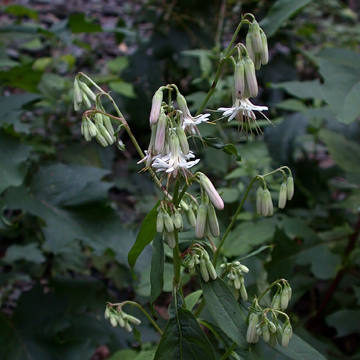 Erect herbaceous perennial to 1.5 m, often glaucous; leaves glabrous above, often hairy beneath, highly variable, the lower long-petioled, palmately or pinnately few-lobed to sagittate or hastate-reniform and merely coarsely toothed, becoming smaller, less cut, and with shorter petioles upward; inflorescence elongate-paniculiform; heads nodding; involucres 11-14 mm, with mostly 8 principle bracts; involucral bracts glabrous, purplish, papillate with white, waxy-appearing cells that are usually distinguishable at 10×; flowers 9-11(-15), mostly white to pinkish or lavender; pappus cinnamon-brown.