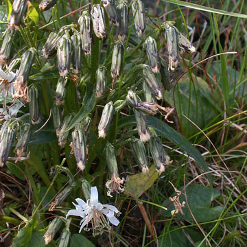 Herbaceous perennial; stems 10-30(-40) cm, glabrous below, villous puberulent above or in the inflorescence; leaves glabrous, pale beneath, entire or merely toothed, the lower with a deltoid or cordate blade 1.5-5 cm long and 1-3 cm wide, exceeded by the petiole; inflorescence narrow, somewhat thyrsoid; heads mostly nodding; involucres 8-12 mm, black or blackish-green, the pigment spots minute and usually crowded; principle bracts 8-11(-13), minutely puberulent at the tip, otherwise glabrous; some of the reduced outer bracts usually at least half as long as the main ones; flowers 9-18, whitish; pappus stramineous; achenes several-ribbed but only obscurely striate.