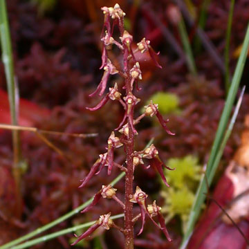 Herbaceous perennial to 30 cm; leaves ovate, 1-3.5 cm, shorter than the peduncle, rounded at the base, abruptly apiculate; axis and pedicels glandular; ovaries glabrous; bracts 1 mm; flowers up to 25, greenish-purple to dull red, the sepals and lateral petals ovate-oblong, reflexed, 2 mm; lip 6-10 mm, narrowly oblong, cleft half its length into 2 slender lobes, and with a pair of narrow, retrorse auricles at the base; column under 1 mm.