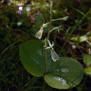 Herbaceous perennial to 30 cm; leaves broadly ovate, 3-5(-7) cm, longer than the peduncle, obtuse or subacute; axis, pedicels, and ovary glandular-puberulent; bracts 3-5 mm; flowers up to 20; sepals and lateral petals 4-5 mm, reflexed; lip greenish, translucent, cuneate, 9-10 mm, deeply retuse and about 5 mm wide at the apex, usually with a short (often obscure) tooth on each side near the narrow base; column 2.5-4 mm.