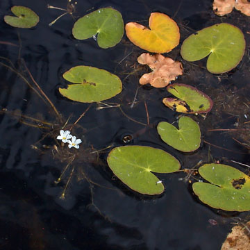 Leaves resemble a tiny water lily. A species with larger flowers, N. aquatica (Walter) Kunzte, occurs on the coastal plain from southern NJ to FL and TX.