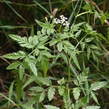 Erect, inodorous perennial from thick roots. Leaves ternately compound, the lower petiolate, upper subsessile; leaflets distinct, serrate, 1 cm or more wide. Umbels peduncled, terminal and lateral, surpassing the leaves, rays 2-8; involucral bracts mostly 3-4, less than 1 mm wide; involucel (secondary involucre) present at flowering; flowers never more than 10 per umbellet; petals white; sepals obsolete; mature styles nearly straight and parallel, 1.5 mm. Fruits slightly flattened laterally, narrow and elongate, not winged.