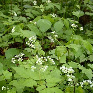 Erect, anise-scented perennial from thick roots. Leaves ternately compound, the lower petiolate, upper subsessile; leaflets distinct, serrate, 1 cm or more wide. Umbels peduncled, terminal and lateral, surpassing the leaves, rays 2-8; involucral bracts 5-6, some more than 1 mm wide; involucel (secondary involucre) present at flowering; flowers often more than 10 per umbellet; petals white; sepals obsolete; mature styles nearly straight and parallel, 2-4 mm. Fruits slightly flattened laterally, narrow and elongate, not winged.
