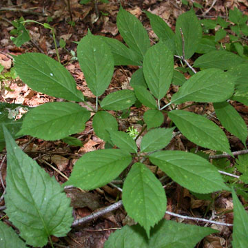 Perennial herb from an elongate, fusiform (spindle-shaped) root. Stems solitary, to 60 cm. Leaves 1-4, palmately compound, typically with 5 leaflets; leaflets acuminate, serrate, the larger more than 8 cm long, on petiolules 1cm or longer. Flowers greenish-white, all or mostly perfect, in a terminal umbel on a solitary peduncle 1-12 cm long; styles typically 2. Fruit a small, bright red, berry-like drupe, with 2-3 pyrenes (stony structures derived from the endocarp, each containing a seed).