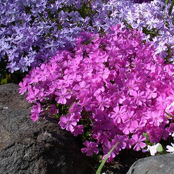 Semi-evergreen from a suffruticose (woody at the base) stem, freely branching and prostrate. Leaves crowded, subulate, mostly 5-10 mm, with a sharp point, usually ciliate, and often with axillary bundles. Flowers in few-flowered cymes; corolla pink, magenta, blue-purple or white, to 20 mm wide; corolla lobes notched at the tip to 1/4 of their length or less; style elongate.