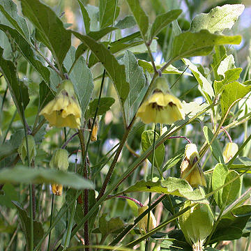 Rhizomatous perennial to 60 cm; stems and petioles pubescent with short, mostly recurved or retrorse hairs. Leaves opposite, mostly more than 1.7 times as long as wide, ovate to lanceolate, acute, toothed to entire, narrowing at the base into a long petiole. Flowers mostly solitary from the nodes on dropping pedicels; calyx evenly pubescent; petals 5, yellow, with a darkened spot at the base. Fruit a red-orange, pulpy, many-seeded berry enclosed by a papery husk formed by the sepals.