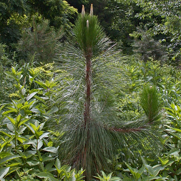 Upright, evergreen conifer to 30 m; bark becoming orange-brown, with rough, scaly plates; twigs very stout; winter buds large, to 2.5 cm, covered with silvery-white, fringed scales; leaves in fascicles of 3, closely crowded at the ends of the branches, persistent 2 years, light green, soft, often drooping, 20-30(-50) cm long; cones divergent, often pendent, conic-oblong, 15-25 cm long and 5-6 cm thick, opening at maturity and soon falling; apophysis thick and prominently ridged, the umbo elevated, with a small, reflexed spine; seeds about 4 cm long.