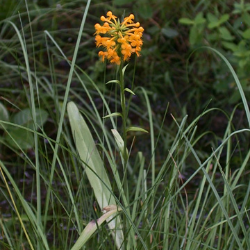 Herbaceous perennial 30-80 cm; lower 1-3 leaves narrowly lanceolate to linear-oblong, to 20 cm, mostly under 2 cm wide; upper leaves much reduced; inflorescence compact, narrow, cylindric, 3-12 cm long and 3 cm wide; flowers numerous, orange; sepals broadly ovate to obovate, 3-5 mm; lateral petals oblong, shorter than the sepals, lacerate or shortly fringed at the summit; lip oblong, long-fringed, 7-10 mm; spur 5-9 mm; orifice often triangular.