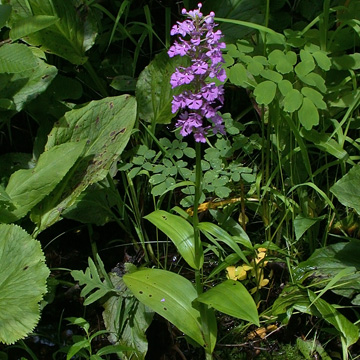 Herbaceous perennial 27-120 cm; lower leaves lanceolate or oval, the upper much reduced and narrow; inflorescence cylindric, densely flowered; flowers purple to rose-purple, rarely white; sepals broadly oval to obovate, the laterals 6-10 mm long and 4-6 mm wide; lateral petals oblong-spatulate, 6-10 mm long and 5-6 mm wide, finely toothed, about equaling the sepals; lip up to 18 mm long and 25 mm wide, deeply 3-parted, each lobe broadly flabellate, deeply toothed, the teeth shorter than the body of the lobe, the terminal lobe scarcely clawed, not notched in the center.