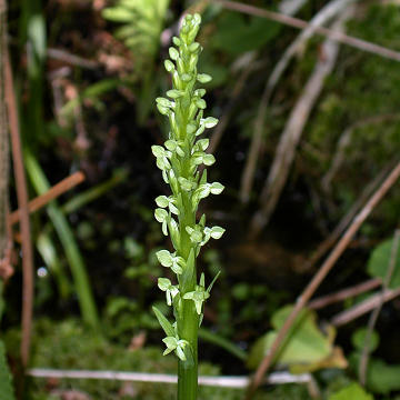 Erect, stout perennial to 1 m; leaves alternate, cauline; lowest leaf bladeless; principle leaves lanceolate to oblanceolate, the upper smaller and passing into the bracts; flowers numerous in a terminal, compact, elongate spike; bracts lanceolate, the lower surpassing the flowers; flowers greenish-white; lip simple, entire, lanceolate to nearly linear, blunt, gradually widened towards the base, 5-12 mm long; lateral petals lance-ovate, incurved under the upper sepals; spur slender, equal to the lip; anther sacs more or less parallel; pollinia remaining enclosed in the anther sacs.