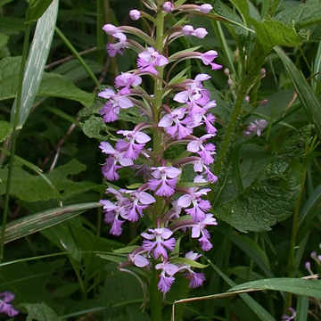 Herbaceous perennial 14-100 cm; lower leaves lanceolate or oval, the upper much reduced and narrow; inflorescence cylindric, densely flowered; flowers purple to rose-purple, rarely white; sepals broadly oval to obovate, the laterals 5-7 mm long and 3-4 mm wide; lateral petals oblong-spatulate, 5-7 mm long and 3-6 mm wide, finely toothed, about equaling the sepals; lip 7-12 mm long and 8-15 mm wide, deeply 3-parted, each lobe broadly flabellate, shallowly toothed, the teeth shorter than the body of the lobe, the terminal lobe scarcely clawed, not notched in the center.