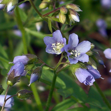 Herbaceous perennial. Leaves alternate, pinnate compound; the leaflets ovate to lanceolate, acuminate, to 1.5" long, opposite to alternate on the rachis. Flowers blue-purple, to 1" wide, in sparse clusters on a long peduncle; corolla lobes 5; stamens 5, tipped white.