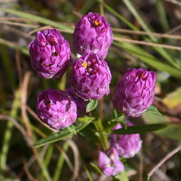 Solitary, erect annual from a slender taproot to 40 cm. Leaves all similar, alternate, linear to linear-oblong or narrowly lanceolate, persistent. Racemes sessile or short peduncled, dense, head-like; flowers pink-purple to white or greenish; less than 11 mm long; wings glabrous, oval, blunt, with a defined midvein; corolla half as long as the wings, the petals not fused into a slender tube. Aril of the seed 2-lobed.