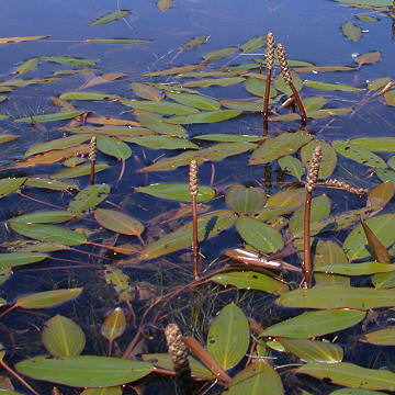 Perennial aquatic with floating leaves; stems 1-2 m long, simple or with a few branches. Submersed leaves thin, narrowly lanceolate to linear, to 30 cm long and 2.5 cm wide, 7-15 veins, acute, gradually tapering to a petiole 2-12 cm long; floating leaves elliptic, to 13 cm long and 4 cm wide, more or less acute; petioles to 20 cm; stipules axillary, free, to 10 cm long, attenuate to obtuse; peduncles to 12 cm long, stout, often thicker than the stem; spikes cylindric, dense, to 5 cm. Fruits somewhat obovoid, to 4 mm, with a sharp, narrow, often tuberculate dorsal keel and occasionally with 2 low ridges on the sides.