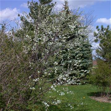 Small deciduous tree. Leaves alternate, simple, ovate, usually widest below the middle, to 4" long, more than twice as long as wide, rounded at base, glabrous or slightly hairy, coarsely serrate with sharply acute, glandless teeth. Young stems dark, smooth, with gray horizontal lenticels, often with thorns; mature bark splitting vertically, edges curling back, somewhat scaly. Flowers white, to 1" wide, pedicellate, in small umbels. Fruit a rounded drupe, to 1" in diameter, yellow to red-purple, sometimes glaucous.