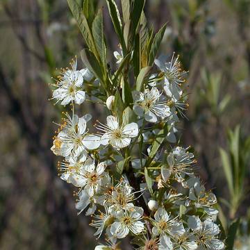 Small deciduous shrub, usually multi-stemmed and irregularly shaped. Leaves alternate, simple, narrowly oblanceolate to obovate, glabrous, teeth reduced or absent below the middle, widest above the middle. Stems reddish-gray with lighter horizontal lenticels. Flowers white, less than 1" across; sepals glabrous; pedicels less than .5" long. Fruit an oval drupe, to .5" in diameter, almost black, astringent.