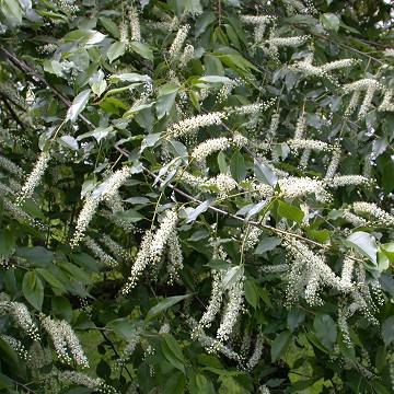 Deciduous tree to 100' high, pyramidal when young and developing a broad crown with age. Leaves alternate, simple, glossy, lanceolate to oblanceolate, at least twice as long as wide, often villous along midrib; teeth appressed or incurved, glandular. Young stems dark red-brown or black with horizontal gray lenticels; mature bark dark red-brown, exfoliating in plates, the lenticels still visible. Flowers white, more than 20, in elongate, ebracteate racemes; calyx lobes narrow, acute, entire or ambiguously glandular, persisting on the fruit. Fruit a round drupe, deep red-black, about 1cm in diameter, in drooping racemes.