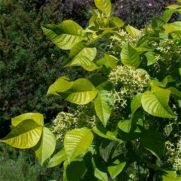 Small tree or large shrub to 20' high, deciduous. Leaves alternate, trifoliate; leaflets ovate to elliptic-oblong, to 4" long, the middle leaflet short-petiolulate; petiole to 3" long. Terminal bud lacking. Stems smooth, red-brown to gray, rounded, dotted; leaf scars U-shaped. Bark gray, smooth with short horizontal lenticels. Buds short, fuzzy. Flowers, greenish, to .5" wide, fragrant, in terminal corymbs to 3" wide; petals 4, rarely 5. Fruit a rounded, wafer-like samara, broadly winged, to 1" diameter, two-seeded.