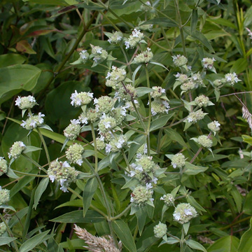 The plants shown here are the eastern var. verticillatum with leaves that are hairy mainly along the veins beneath. The more western var. pilosum is more hairy, with the stem conspicuously spreading-pilose and the lower leaf surfaces evenly spreading-hairy and the calyx more or less shaggy. Might be confused with P. virginianum which has the pubescence of the stem confined mainly to the angles; P. verticillatum is evenly pubescent on the faces as well as the angles. Pycnanthemum torrei is most like P. verticillatum but has softer and less veiny leaves, calyx teeth longer and sharper (1-1.5 mm), and involucral bracts that are lanceolate and acuminate to aristate.