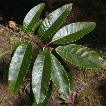 Deciduous tree to 70' high. Bark gray with flat ridges and shallow furrows. Leaves dark green and shiny above with elevated veinlets, loosely pubescent below, alternate, simple, entire, bristle tipped, mostly 10-15 by 3.5-6 cm. Acorns dark brown, less than half enclosed by the slightly hairy, red-brown cup; scales few and broad.