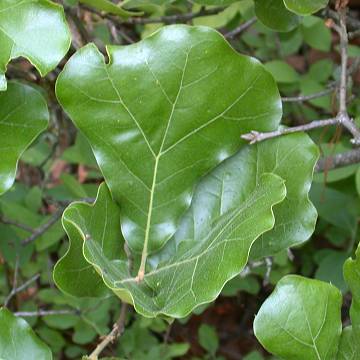 Deciduous tree 50-80' high. Leaves simple, alternate, obovate, entire to 3-lobed at the apex. Acorns solitary, to 1/2" long and wide, the cap shallow with appressed scales; the nut striped with brown and black. Bark dark and rather smooth.