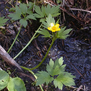 Herbaceous perennial. Basal and cauline leaves similar, as wide or wider than long; basal leaves larger, mostly 3-lobed, the lobes acute or acuminate. Flowers waxy-yellow; petals 5-8; sepals reflexed; style elongate, slender, nearly straight. Mature receptacle ellipsoid or clavate. Fruit a smooth, flattened, achene with raised lateral nerves bordering the narrow margin.