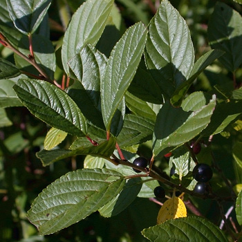 Deciduous shrub to about 1 m; leaves alternate, lance-oblong to elliptic, obtuse to acuminate, crenate-serrate; flowers functionally unisexual, sessile, 1-3 per node, 5-merous; hypanthium saucer-shaped; sepals 1.5-2 mm; petals absent; styles ca. 1 mm, connate for a third of their length; fruit black, shiny, 6-8 mm, containing 3 stones; winter buds scaly.