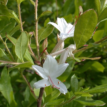 Deciduous, branching and often colonial shrub to 2 m. Leaves thin, setose-hairy, eglandular, oblanceolate to obovate, 3-6 cm. Flowers white (rarely pink), appearing after the leaves emerge, pedicels and corolla-tube stipitate-glandular; corolla funnelform, the lobes reflexed and a little shorter than the tube in length but more than half as long); stamens 5; ovary stipitate-glandular.
