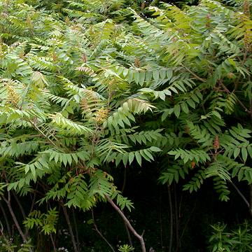 Colonial shrub or small tree to 10 m. Twigs and petioles densely hairy. Leaves pinnately compound; leaflets 9-29, acuminate, serrate, pale beneath. Flowers greenish-yellow in a terminal inflorescence. Fruits red, somewhat flattened, and covered with elongate, tapering hairs.