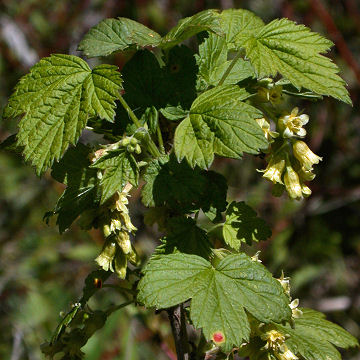 Shiny, golden glands are present below the leaf but some can occur above the leaf, as seen in the last image. The fruits picture here were not yet ripe. I have not personally tried them and thus cannot attest to the palatability. The name "gooseberry" is usually applied to members of this genus with bristly fruit that remains attached to the pedicel, while the name "currant" is used for species with smooth fruit that separates easily from the pedicel.
