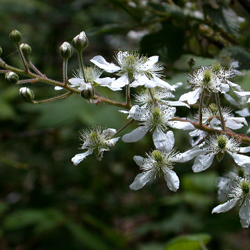 Woody perennial to 2 m. Stems woody, biennial, bearing stout, stiff, hooked prickles, bearing flowers the second year. Leaves palmately compound; leaflets usually five. Flowers white, in long, terminal, racemiform inflorescences; pedicels with glandular hairs. Fruit a blue-black cluster of drupelets remaining attached to the receptacle at maturity.